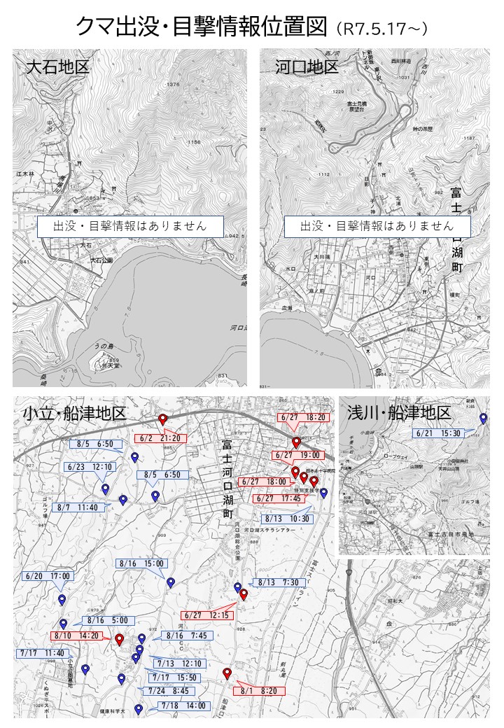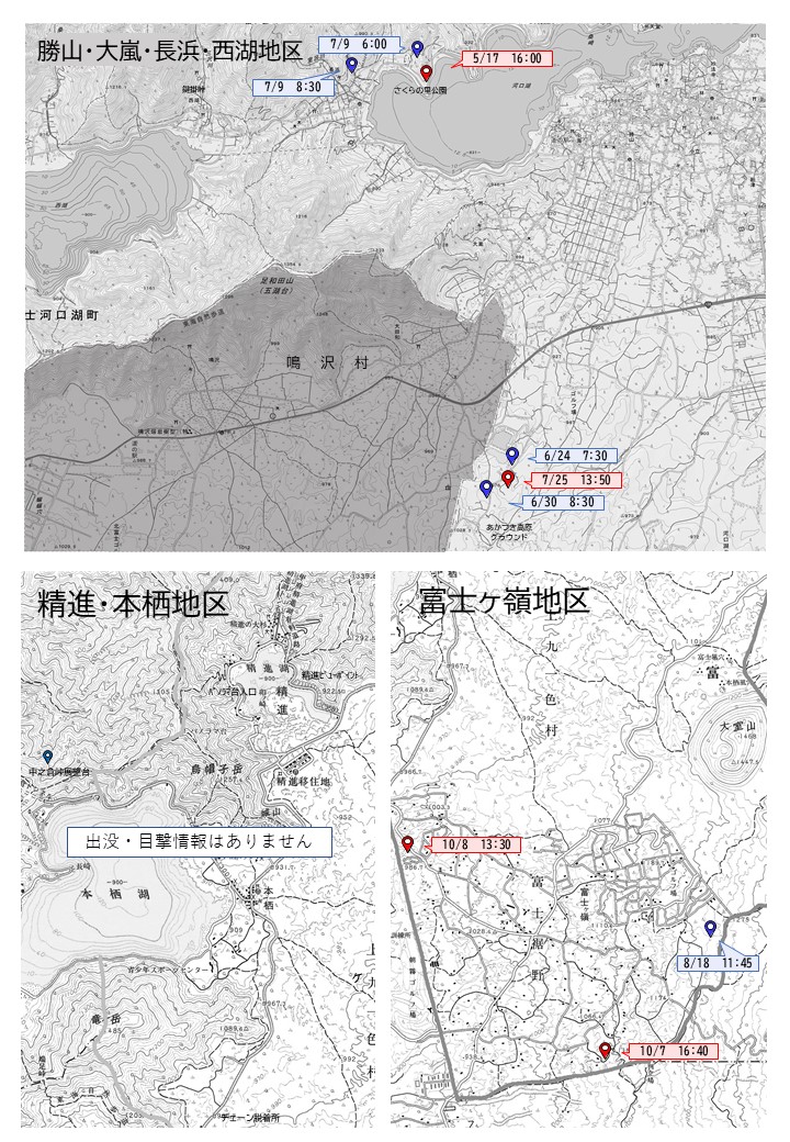 令和5年6月から12月までの間に、河口地区、大石地区、長浜地区、西湖地区で計43件の目撃情報がありました。河口字御坂山周辺で多く目撃されています。