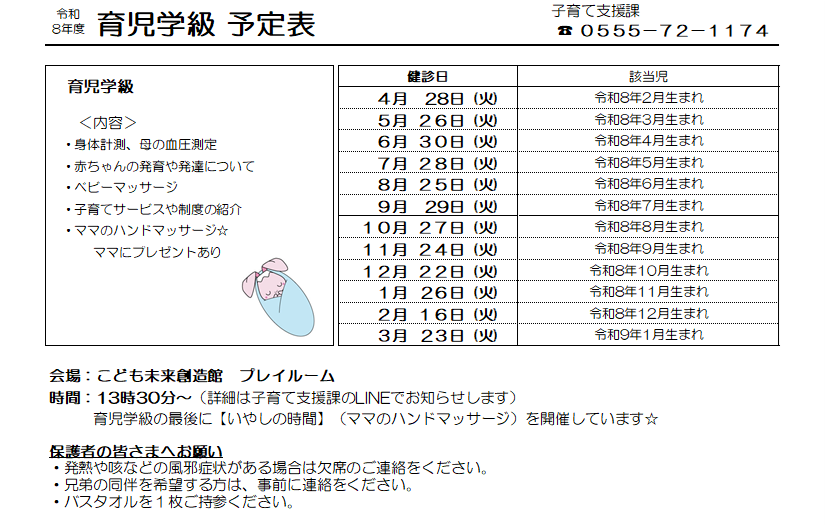 令和8年度 育児学級 年間予定表