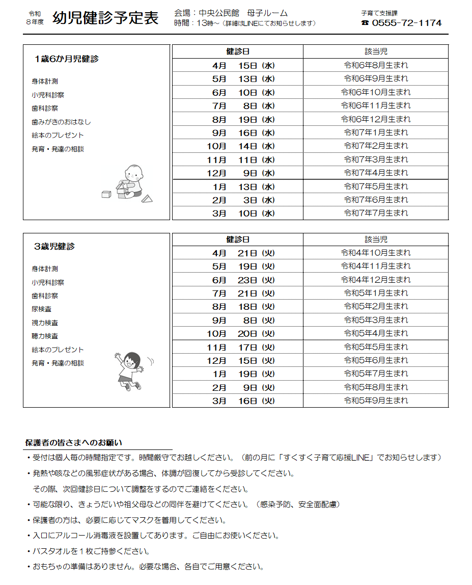 ※各健診の受付は、個人毎の時間指定です。時間厳守でお越しください。(前の月に「すくすく子育て応援LINE」でお知らせします)