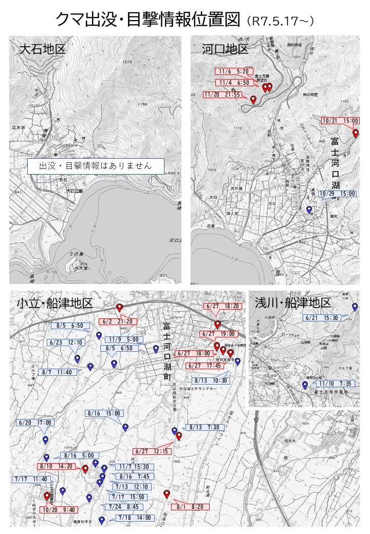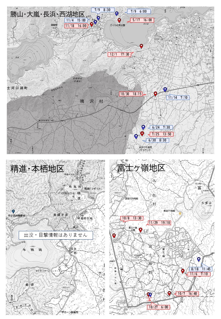 令和5年6月から12月までの間に、河口地区、大石地区、長浜地区、西湖地区で計43件の目撃情報がありました。河口字御坂山周辺で多く目撃されています。