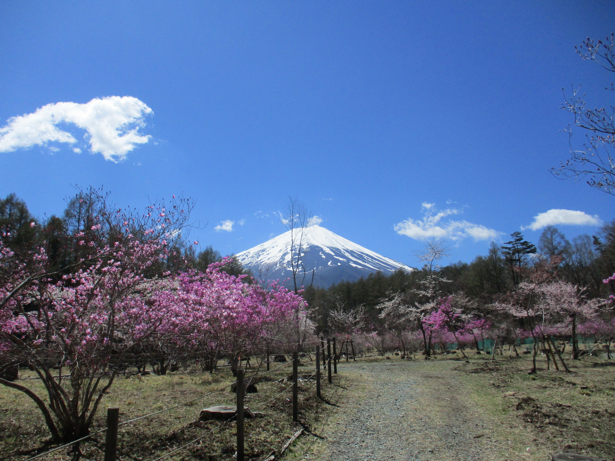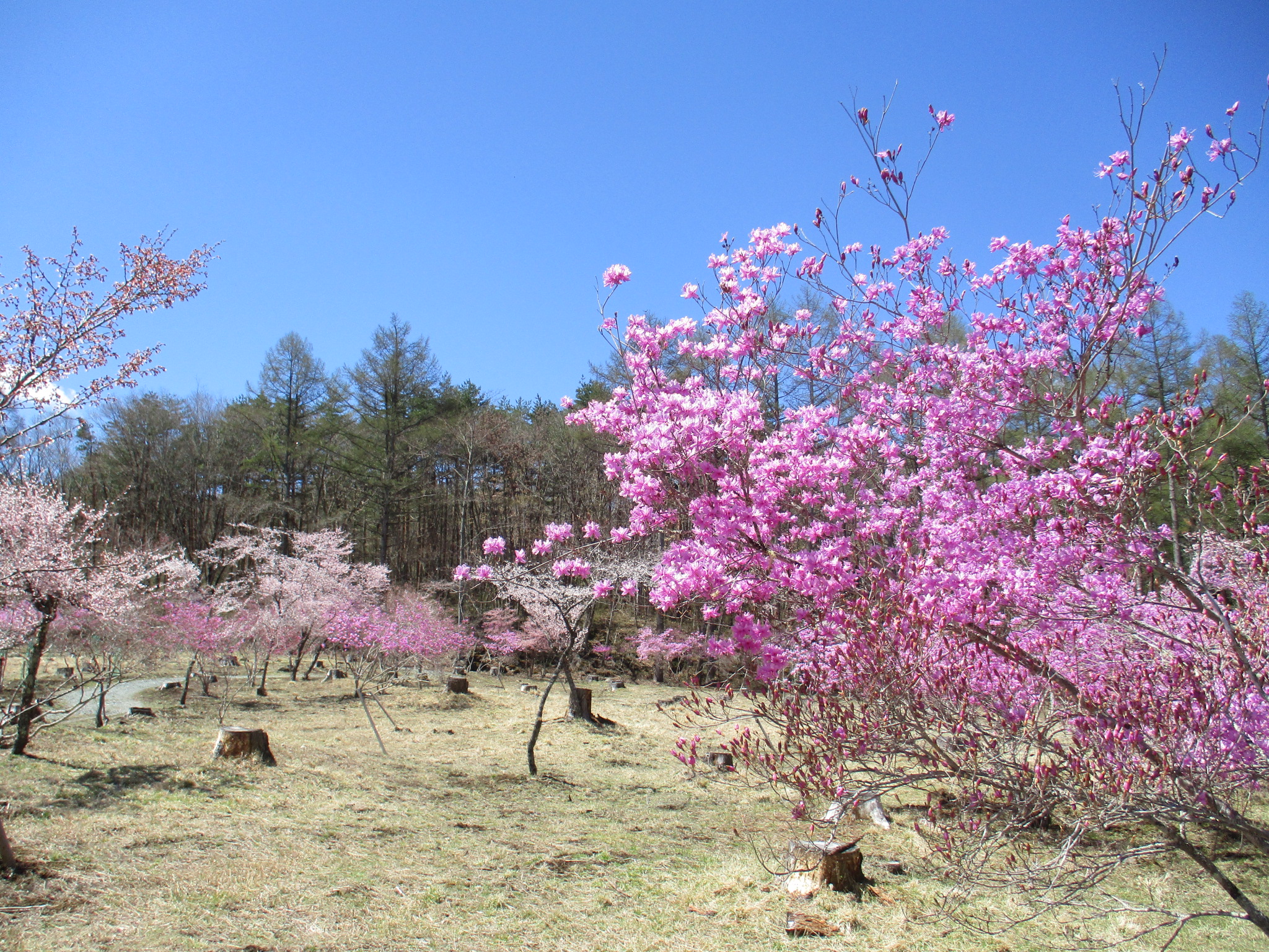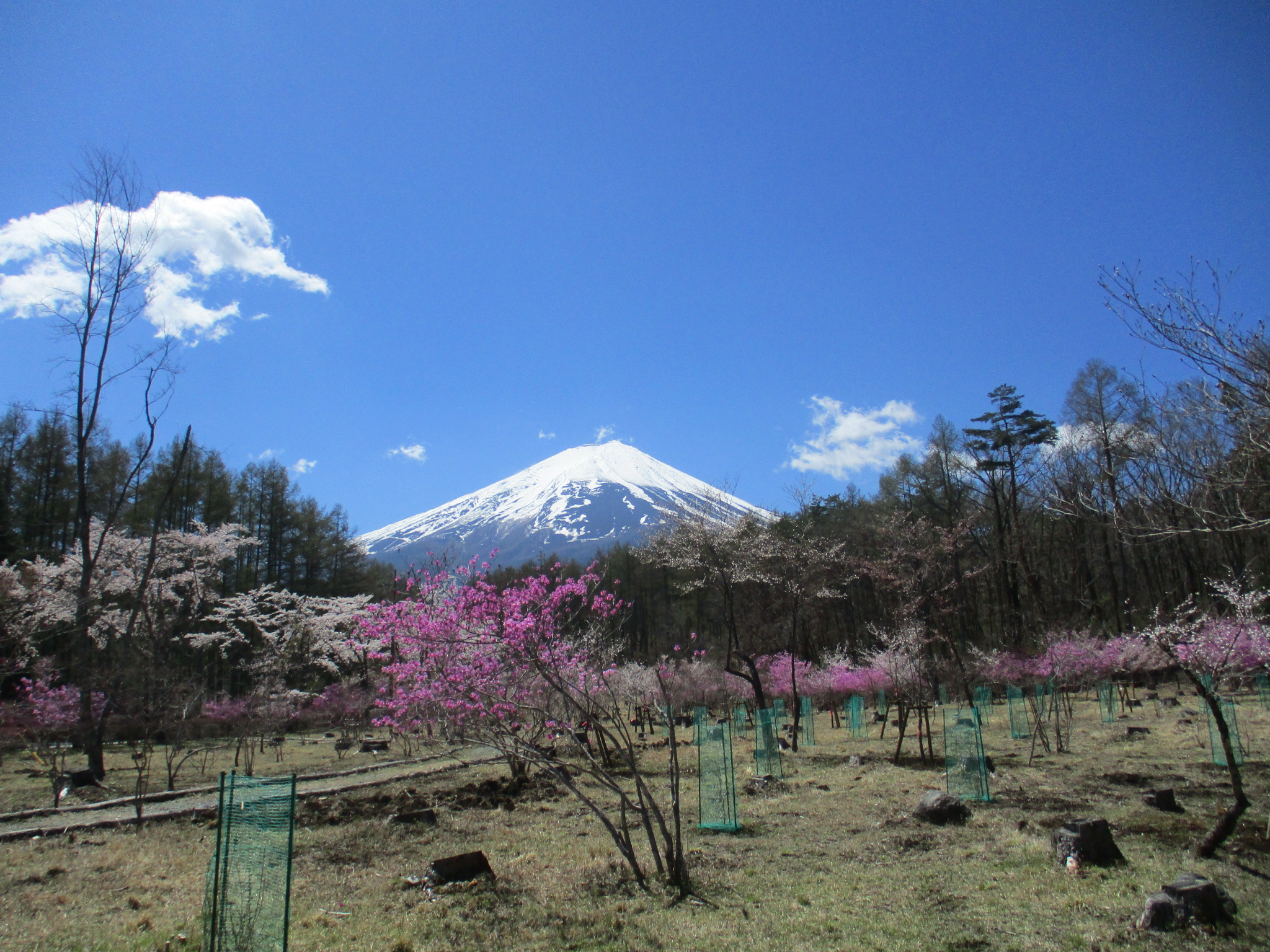 〇見頃を迎えています!(4月16日現在) 富士桜がきれいに開花し、見ごろを迎えています。 例年、富士桜よりも少し後に開花するミツバツツジも咲き始め、早い木は見ごろを迎えています。 どちらも場所によってはまだ蕾の木もありますので、しばらくは楽しんでいただけそうです。