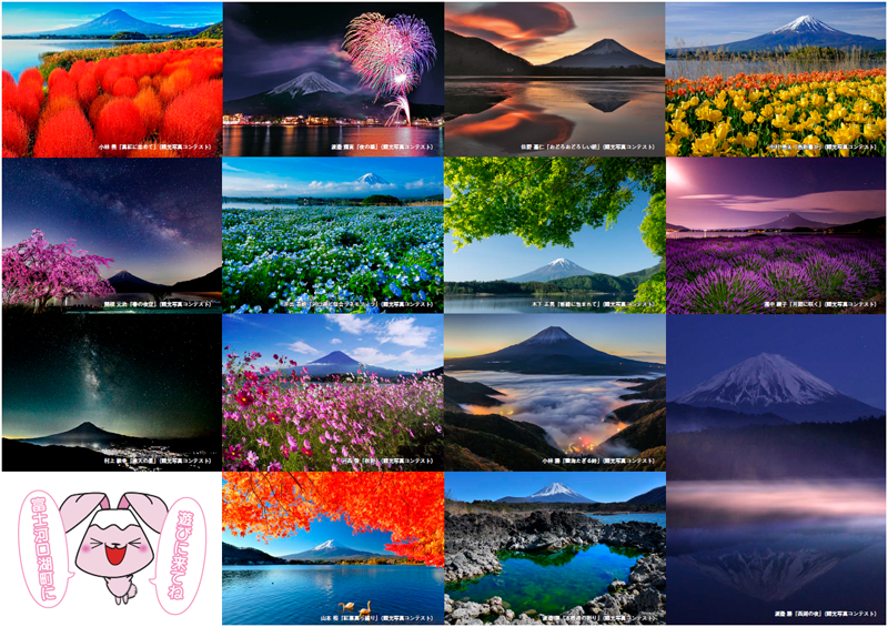表紙 裏表紙 各月 富士河口湖町町民カレンダーは、例年「富士山写真大賞展」「富士河口湖町観光写真コンテスト」の入選作品等の中から写真を採用し、作成しています。