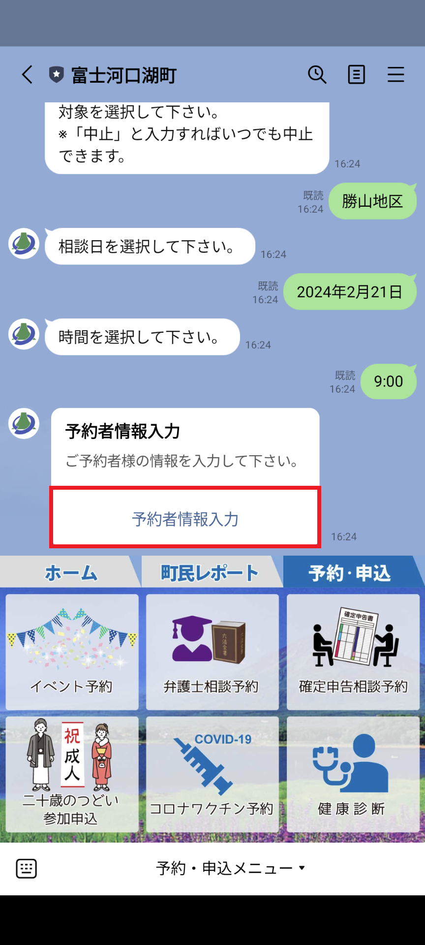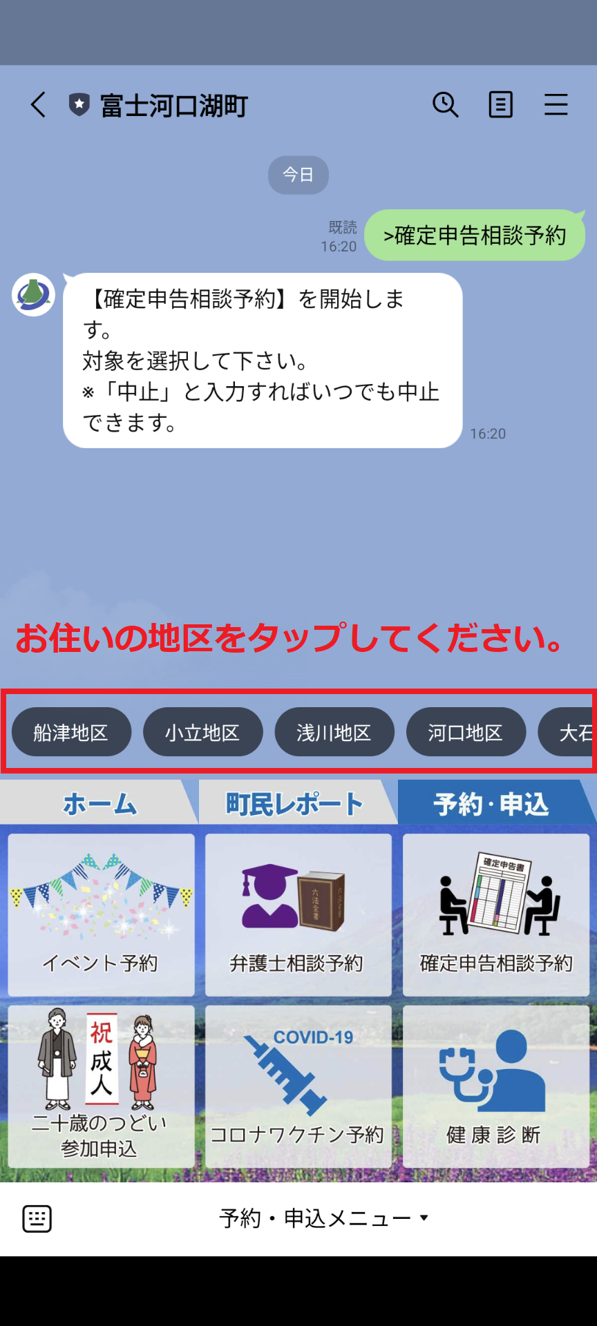 ② トーク画面の「予約・申込」から「確定申告相談予約」を選択