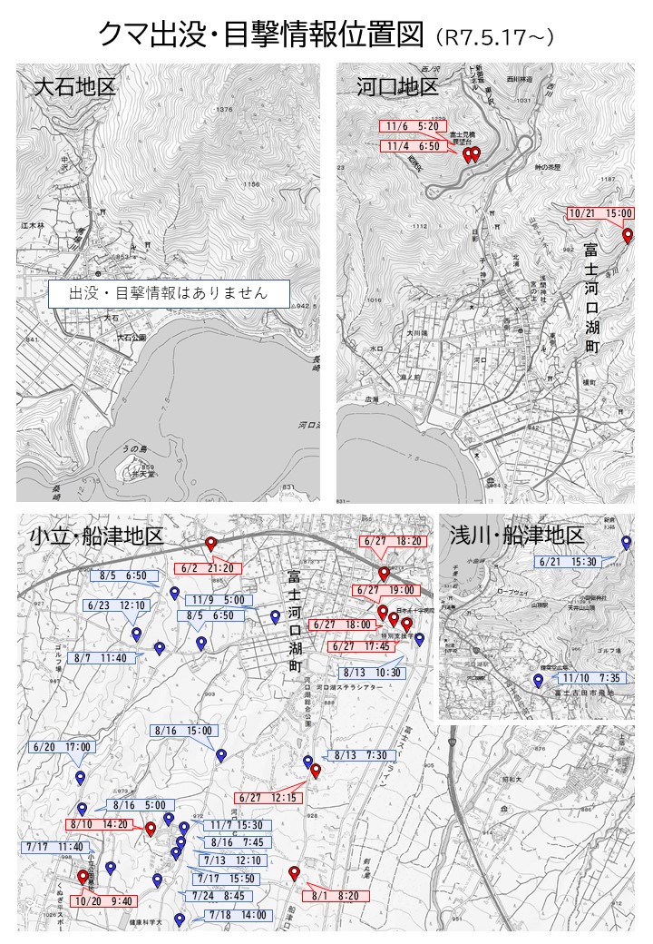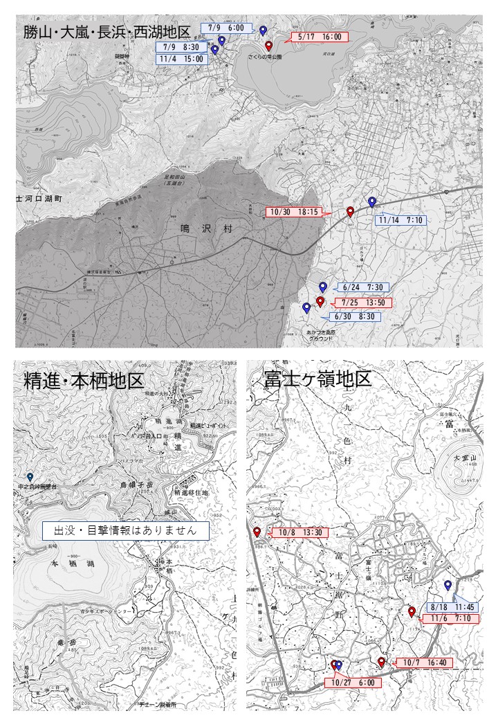 令和5年6月から12月までの間に、河口地区、大石地区、長浜地区、西湖地区で計43件の目撃情報がありました。河口字御坂山周辺で多く目撃されています。